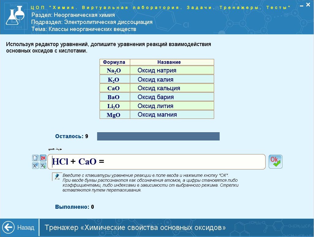 ЦОП «Химия. Виртуальная лаборатория. Задачи. Тренажеры. Тесты» включает: